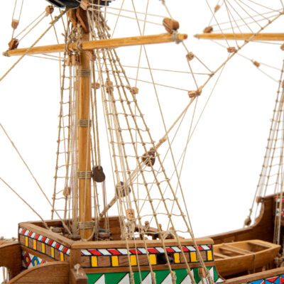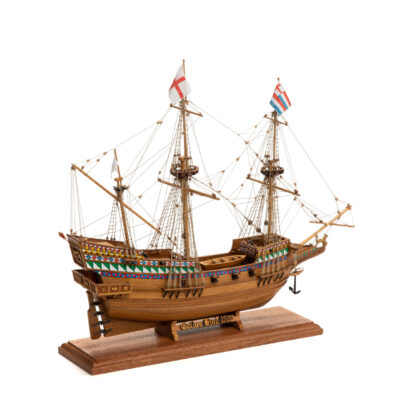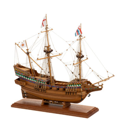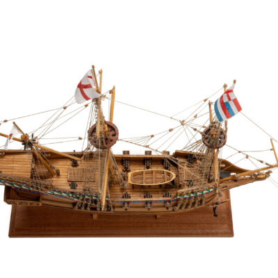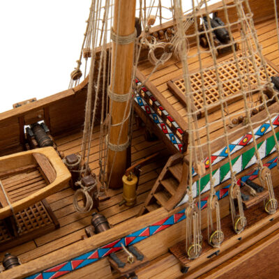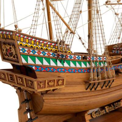 Conformément aux caractéristiques d’un navire de guerre du 16ème siècle, le Golden Hind a une coque d’une trentaine de mètres sur six de large et un plan de voilure typique avec un grand mât et mât de misaine à plan carré, ainsi qu’un mât d’artimon à voile latine et une civadière sur le beaupré. Il est préparé pour être bien adapté aux futures expéditions corsaires et d’explorations de Francis Drake.