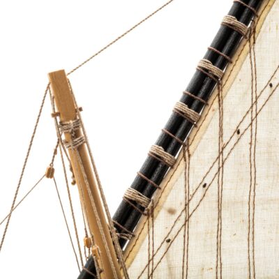 Cette maquette de bateau unique dispose de détails d’une très grande finesse que nous avons mis en valeur grâce à notre savoir-faire : du gréement aux poulies, en passant par les ornements et pièces de décoration, chacun des éléments qui le nécessitait a été restauré pour magnifier le modèle d’origine. Conçue à partir d’un kit, elle constitue une reproduction fidèle et très haut de gamme de ce typique bateau méditerranéen.