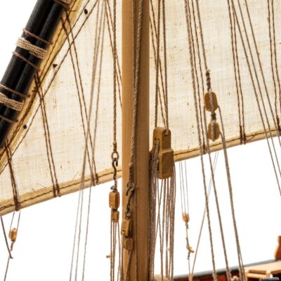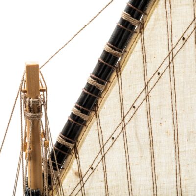 La coque de cette maquette en bois est conçue comme celle des bateaux anciens, et réalisée par pose de lattes sur couples. L’accastillage très détaillé, aux finitions soignées fait de cette maquette une œuvre décorative remarquable. Les voiles sont entièrement cousues manuellement et le gréement reproduit très fidèlement celui du vaisseau d’origine. Entièrement peinte à la main, son niveau de finition et de finesse est remarquable.